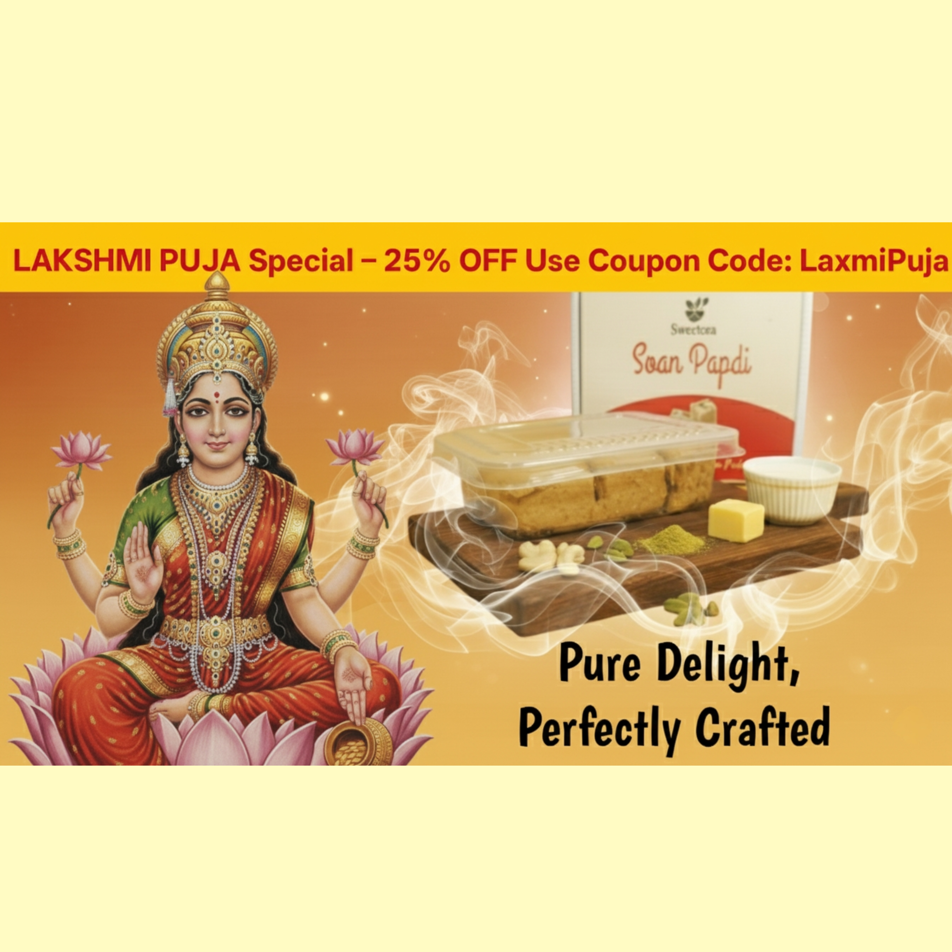 On the morning of Lakshmi Puja, homes fill with joy and the aroma of sweets. SweetOra Soan Papdi is not just sweet, but a true source of energy! Enjoy 25% OFF with coupon LaxmiPuja. Pure Delight, Perfectly Crafted!