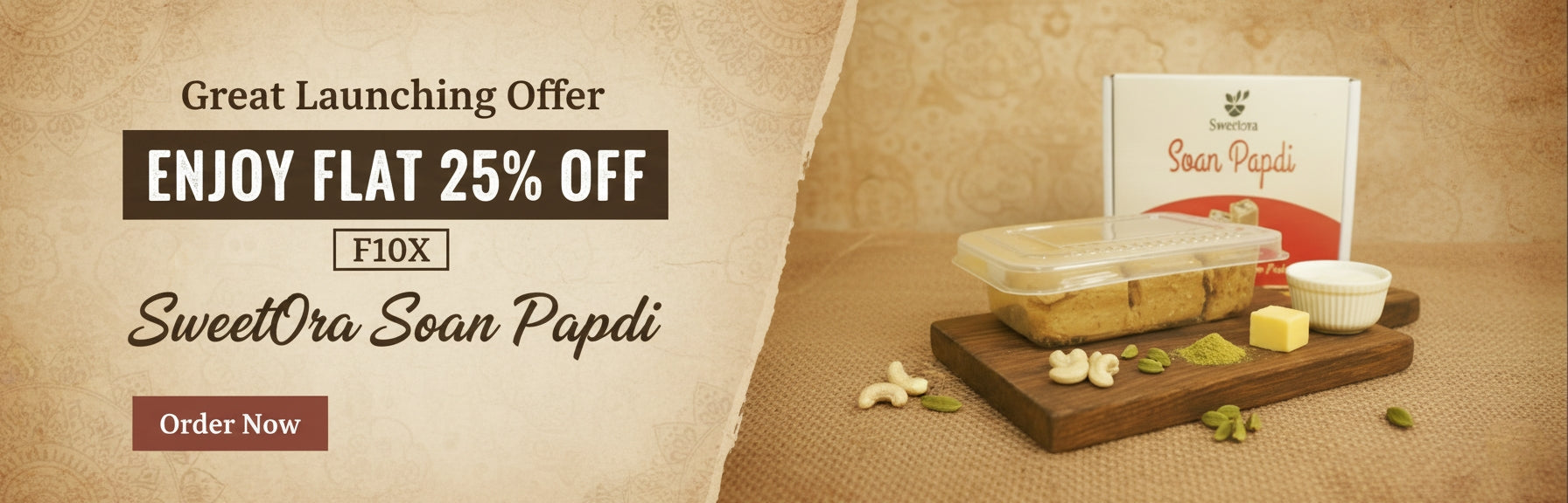 On the morning of Lakshmi Puja, homes fill with joy and the aroma of sweets. SweetOra Soan Papdi is not just sweet, but a true source of energy! Enjoy 25% OFF with coupon LaxmiPuja. Pure Delight, Perfectly Crafted!